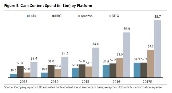 瑞银去年的研报中指出,自2013年以来奈飞在内容支出上已将其他流媒体竞争对手(Hulu、HBO、亚马逊)远远地甩在了后面。