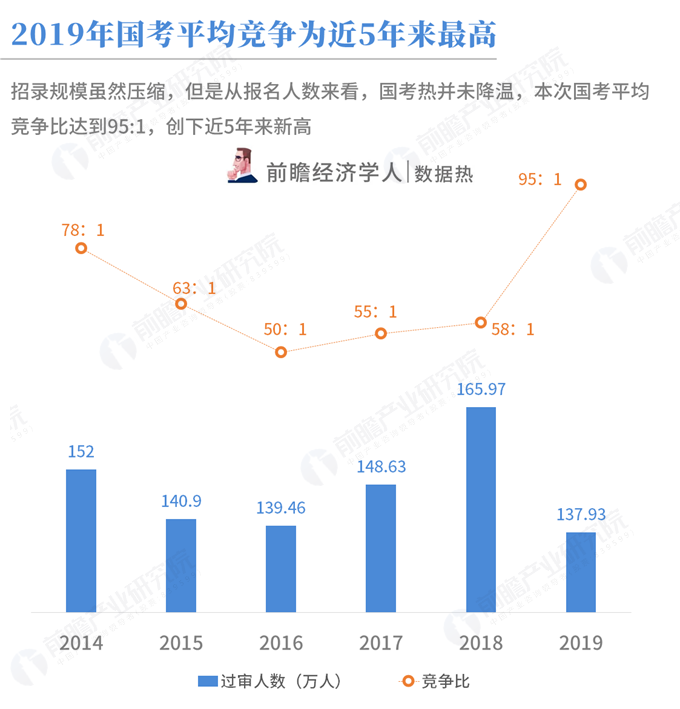 这几天“国考”可以说是人们茶余饭后谈论最多的一个话题。昨日(12月2日),中央机关及其直属机构2019年度公务员招考笔试举行,全国75个中央机关单位和20个直属机构计划招录公务员1.45万人,共有137.93万人通过报名资格审查,平均竞争比95:1,超过近五年来最高竞争比,最热职位竞争比例高达4040:1,成为“史上最难”国考。不过,按照国家公务员局统计数据,在通过资格审查的137.93万人中,有108万余人缴费确认参加笔试,92万人实际参加考试,参考率约为84.5%,参加考试人数与录用计划数比例约为63:1。