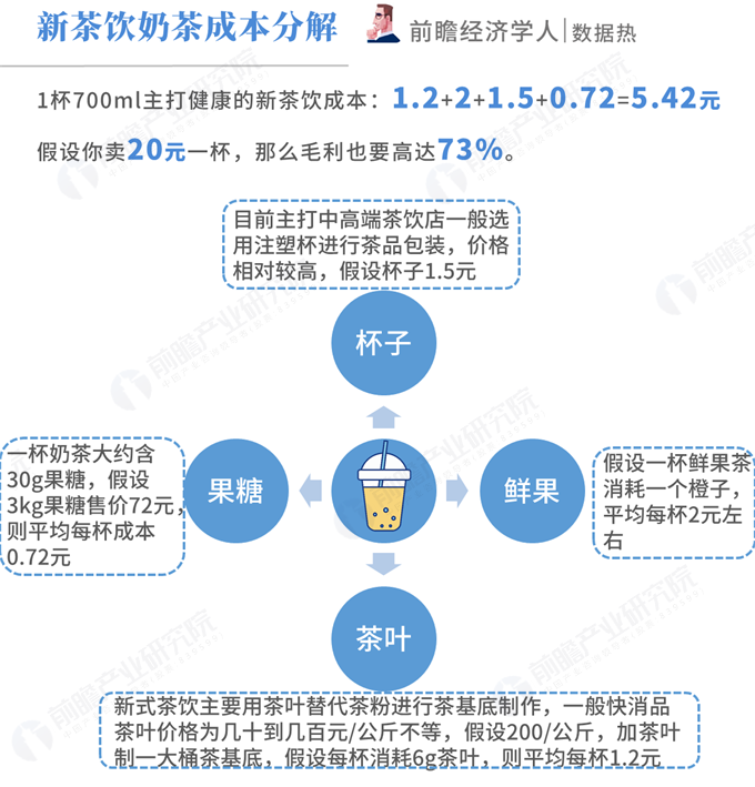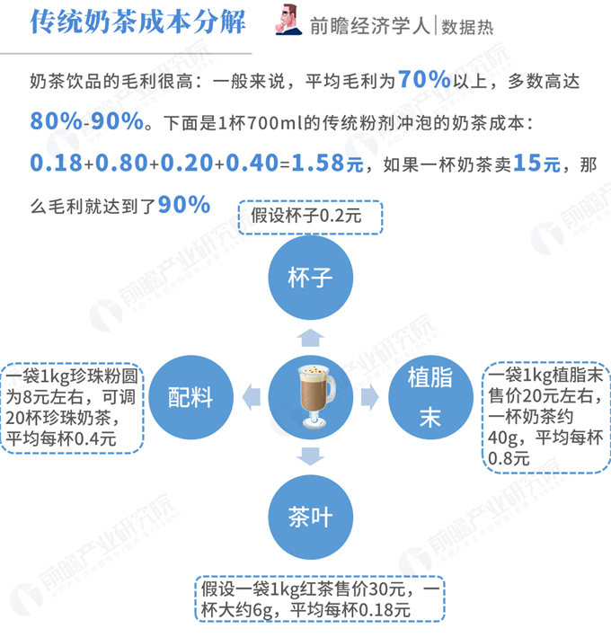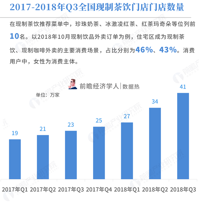 截止到20107年中国咖啡及其他饮品店销售额突破千亿元,其他现制茶饮店销售额达到了472亿元。预计2018年中国咖啡及其他饮品店销售额将达1116亿元,其他现制茶饮店销售额将达537亿元。以2018年10月现制饮品外卖订单为例,住宅区成为现制茶饮、现制咖啡外卖的主要消费场景,占比分别为46%、43%。消费用户中,女性为消费主体。调研数据显示,过去一年中,新式茶饮消费群体中女性消费者占比高达73%,男性仅占27%。此外,25岁以下的消费群体占比高达42%,20-30岁占比也达到了29%,即30岁以下消费人群占比达到71%,在现制茶饮推荐菜单中,珍珠奶茶、冰激凌红茶、红茶玛奇朵等位列前10名但你知道一杯奶茶成本有多低,利润有多高吗?