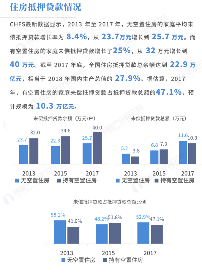 中国住房空置率为21.5%,仅低于西班牙和意大利,高过全球多数国家。而这些空置住房占用了超过10万亿元的信贷资源。CHFS最新数据显示,2013年至2017年,无空置住房的家庭平均未偿抵押贷款增长率为8.4%,从23.7万元增长到25.7万元。而有空置住房的家庭未偿抵押贷款增长了25%,从32万元增长到40万元。截至2017年底,全国住房抵押贷款总余额达到22.9万亿元,相当于2018年国内生产总值的27.9%。据估算,2017年,有空置住房的家庭未偿抵押贷款占抵押贷款总额的47.1%,预计规模为10.3万亿元。在当前房价下,现值低于购买成本的空置住房比例为5.6%,略高于非空置住房比例的5%。如果房价下跌5%,空置住房遭受损失的比例将加速上升到12.2%,而非空置住房遭受损失的比例仅上升到7.8%,并随着跌幅比例继续扩大。