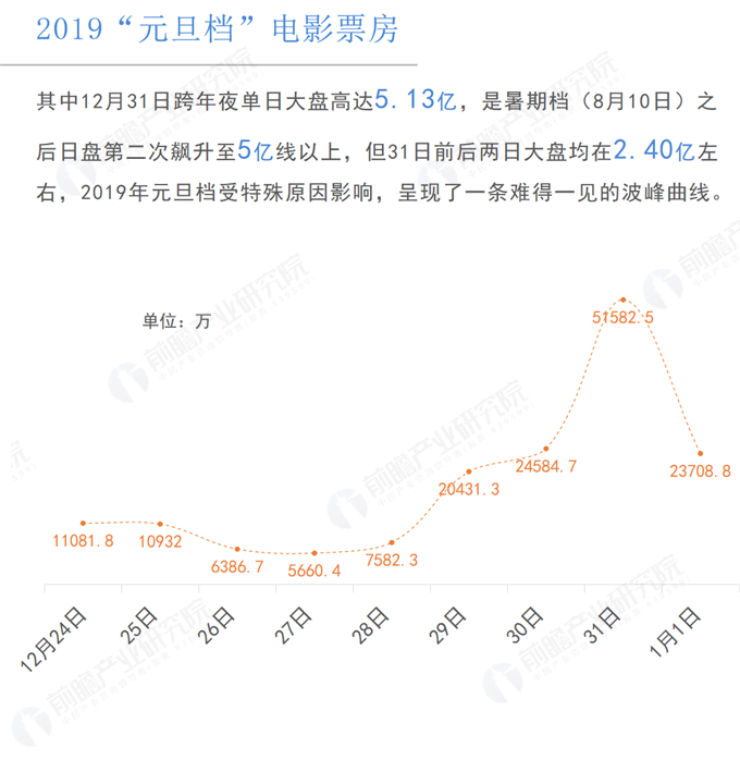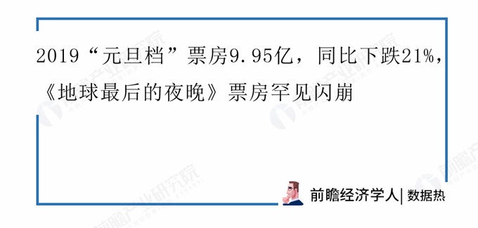 2019“元旦档”(12.30-1.1)三天9.95亿(分账票房9.17亿),相比去年元旦档下跌21.71%,虽不及去年,但也是历史第二高产的元旦档。其中12月31日跨年夜单日大盘高达5.13亿,是暑期档(8月10日)之后日盘第二次飙升至5亿线以上,但31日前后两日大盘均在2.40亿左右,2019年元旦档受特殊原因影响,呈现了一条难得一见的波峰曲线。元旦档冠军《来电狂响》三天2.83亿,在31日当天被《地球最后的夜晚》压制的情况下,仍然上涨18.54%,强势破亿,次日仅跌9.16%,走势为贺岁档新片最佳,目前累计票房3.77亿。《地球最后的夜晚》凭借单日2.61亿的成绩拿下元旦档票房亚军。这部电影创造了多个惊人数据:首映日预售票房1.59亿,历史第五;首日票房2.61亿,历史第11;次日票房仅1113.8万,跌幅高达95.74%,也是亿元以上电影的次日最大跌幅;猫眼开分3.7分,目前已跌至2.7分,在2018年仅高于国产恐怖电影《恐怖快递》。目前预测《地球最后的夜晚》总票房2.84亿,首日票房占比高达90%以上,实属罕见。