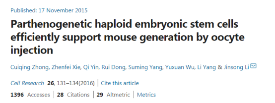 研究人员首先通过孤雌激活卵子的方法获得了单倍体的孤雌发育的囊胚,并从中建立了6株孤雌单倍体胚胎干细胞,随后他们将其注入卵子中产生胚胎并移植到假孕小鼠的子宫内,然而所有的移植胚胎均不能发育成个体。