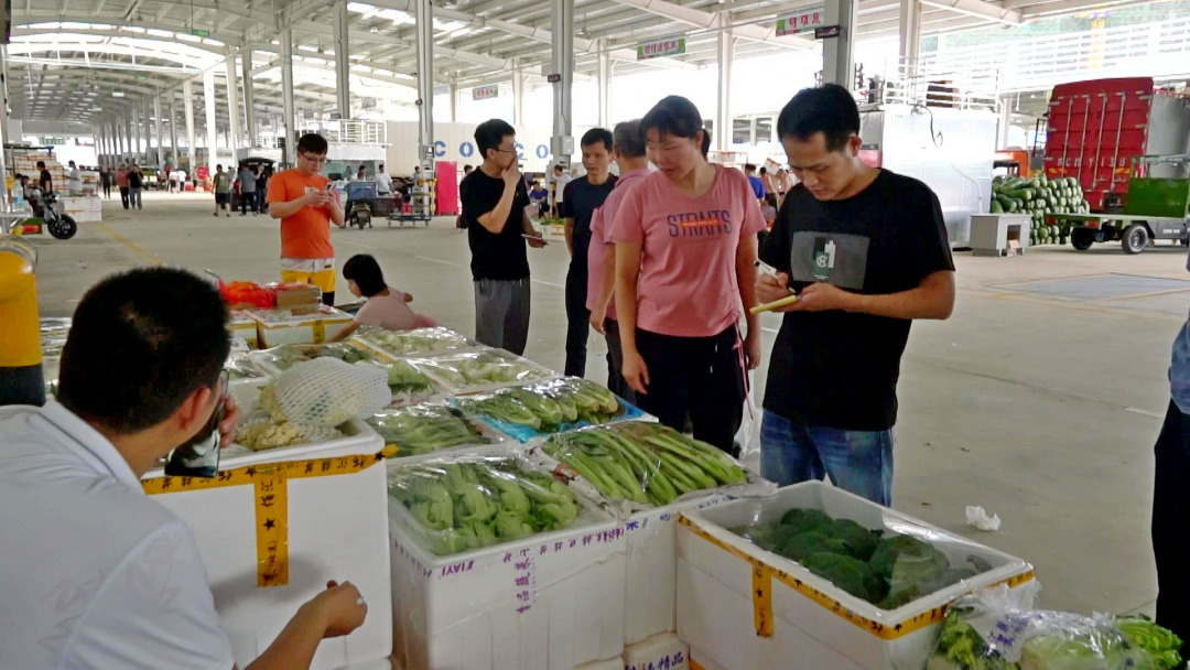 “然后他这边品类是也几乎是全部都齐全了,因为这边档口比较多,一个档口两部车的话。光是菜类这一块,这边就有几百个品种了。”