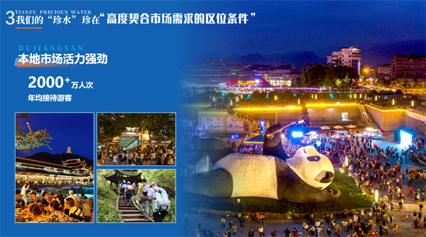 文旅融合,市场广阔:都江堰市拥有丰富的文旅资源,全市2071个旅游资源点,年均接待游客2000万人次,旅游综合收入达400亿元。灌县古城国家级夜间文化旅游消费集聚区、融创热雪奇迹全国十大冰雪旅游精品线路、虹口漂流国家体育旅游精品线路、熊猫谷全国亲子热门动植物园等优质资源,共同构成了丰富的文旅业态,也为食品饮料产业提供了广阔的消费市场和品牌展示窗口。