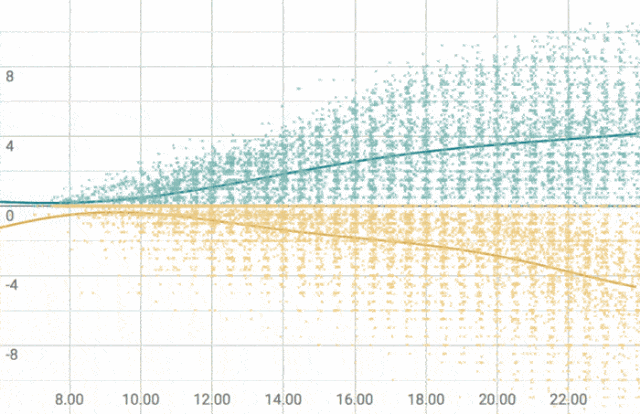 横轴是从早上7点到晚上24点,绿色是我的工作时间,黄色是我的休闲时间,动点是我一天的累计工作时间,最终的数据就会变成背后对应的小点,实线是所有平均数的连线,如果我哪天的工作时间是平时的两倍,我会觉得很充实,或者说我今天玩的时间超过了工作时间,那我也知道,哦,我玩脱了。于是,整个记录过程中我每一天的工作时间的累积,都在这个图上一目了然。