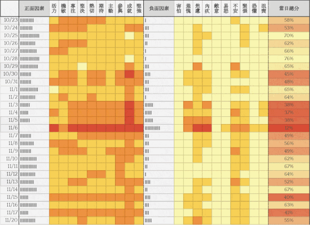 这就是我的情绪自测表。它上面有20个情绪因子,10个正面的,10个负面的。颜色越淡说明状态越好,颜色越深越偏红说明我心情越差。我每天会对自己的情绪按照0~3的不同程度进行打分,分数越高代表心情越好。
