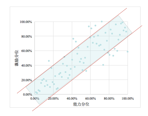但企业在这个方面做得究竟如何,没人说得清楚。于是,我将员工的能力水平和获得的激励水平都变成了数据,并放入一个二维矩阵中,再建立了两条能岗匹配的红线,夹住的部分就是“能岗适配区”(如图1)。
