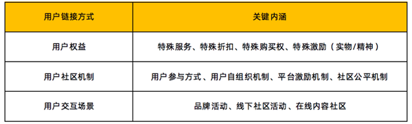 主要指的是品牌与用户的交互过程和用户与用户之间的交互过程,具体分为用户权益、用户社区机制和用户交互场景三个维度来展开,关键要素陈述详见下方表格。
